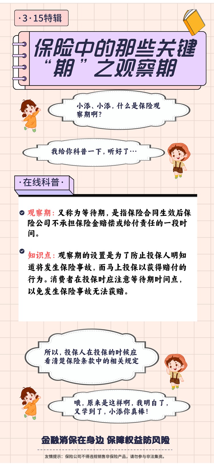 3月4日—3月15日,國家金融監(jiān)督管理總局重慶監(jiān)管局開展以“金融消保在身邊 保障權(quán)益防風(fēng)險”為主題的2024年重慶“3·15”金融消費者權(quán)益保護教育宣傳周活動。為做好金融消保知識宣傳教育,切實提升群眾金融素養(yǎng)和風(fēng)險防范意識,平安人壽重慶分公司積極響應(yīng)監(jiān)管部署,推出金融消保課堂系列分享。本期分享主題為:《保險中的那些關(guān)鍵“期”之觀察期》。(平安人壽重慶分公司)