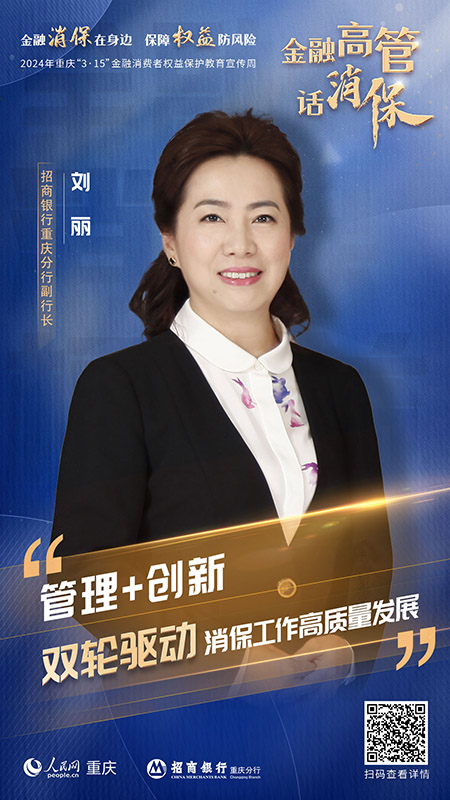 劉麗:一直以來,招行重慶分行在“以客戶為中心,為客戶創(chuàng)造價(jià)值”核心價(jià)值觀引領(lǐng)下,堅(jiān)持服務(wù)初心,立足經(jīng)營實(shí)際,持續(xù)優(yōu)化金融產(chǎn)品和服務(wù)體驗(yàn),不斷增加金融服務(wù)的獲得感、幸福感和安全感。接下來,將以管理、創(chuàng)新雙輪驅(qū)動(dòng),深化消保管理,切實(shí)保障金融消費(fèi)者合法權(quán)益,為建設(shè)和諧金融消費(fèi)環(huán)境貢獻(xiàn)招行力量。