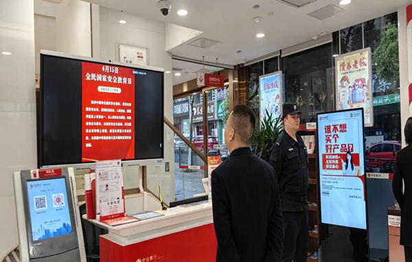 在針對客戶的宣傳中,各營業(yè)網(wǎng)點充分利用門頭的LED屏滾動播放“4.15全民國家安全教育日”宣傳語錄,并在網(wǎng)點的休息區(qū)、業(yè)務(wù)辦理區(qū)等重要區(qū)域張貼全民國家安全教育標(biāo)識,加大廣大客戶的關(guān)注度,幫助公眾樹立“總體國家安全教育觀”。