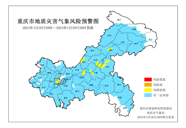 4月28日16時(shí),重慶市規(guī)劃和自然資源局、重慶市氣象局聯(lián)合發(fā)布全市地質(zhì)災(zāi)害氣象風(fēng)險(xiǎn)預(yù)警。
