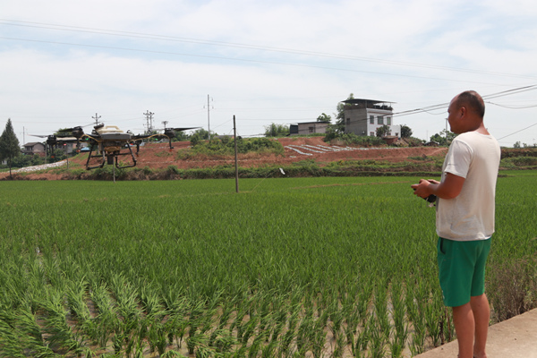 在重慶市合川區(qū)隆興鎮(zhèn)的高標(biāo)準(zhǔn)農(nóng)田里,工作人員操作無人機(jī)噴灑作業(yè)。張睿 攝