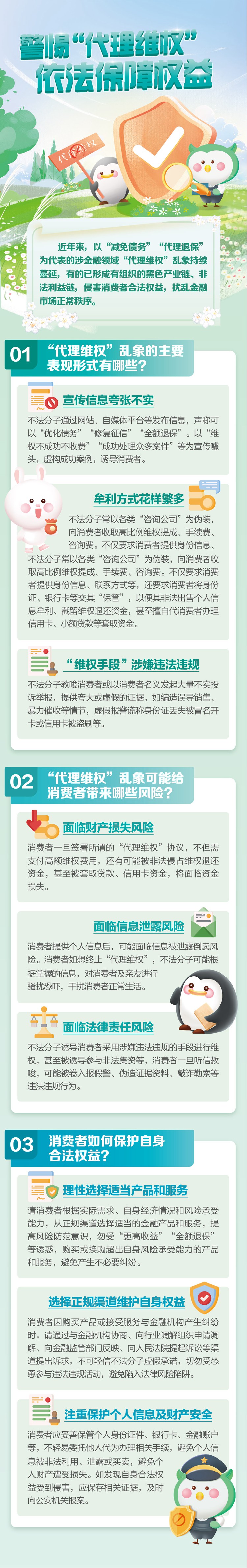 近年來,以“減免債務(wù)”“代理退?!睘榇淼纳娼鹑陬I(lǐng)域“代理維權(quán)”亂象持續(xù)蔓延,有的已形成有組織的非法利益鏈,侵害消費者合法權(quán)益,擾亂金融市場正常秩序。招行重慶分行溫馨提示廣大市民要通過正規(guī)渠道理性選擇金融產(chǎn)品和服務(wù),警惕“代理維權(quán)”陷阱,依法保障自身合法權(quán)益。(招行重慶分行)
