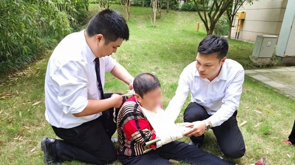 招商雍璟城物業(yè)工作人員為摔倒在地的老人進行簡易包扎和固定。招商雍璟城物業(yè)供圖