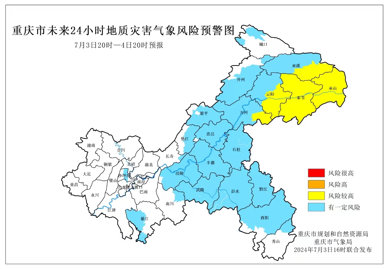 7月3日20時至7月4日20時,巫山縣、巫溪縣、奉節(jié)縣、云陽縣、萬州區(qū)屬于風(fēng)險較高地區(qū),地質(zhì)災(zāi)害氣象風(fēng)險等級為III級(黃色預(yù)警),城口縣、開州區(qū)、石柱縣、豐都縣、忠縣、涪陵區(qū)、長壽區(qū)、墊江縣、梁平區(qū)、綦江區(qū)、南川區(qū)、武隆區(qū)、彭水縣、黔江區(qū)、酉陽縣、秀山縣、重慶高新區(qū)、沙坪壩區(qū)屬于有一定風(fēng)險地區(qū),地質(zhì)災(zāi)害氣象風(fēng)險等級為IV級(藍色預(yù)警),請相關(guān)區(qū)縣注意防范。