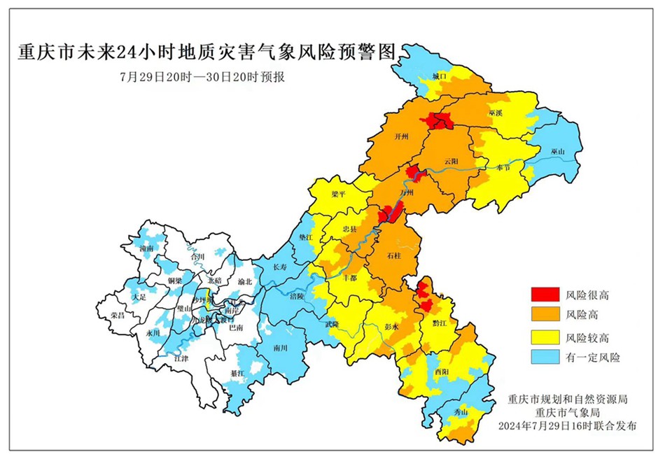 7月29日16時(shí),重慶市規(guī)劃和自然資源局、重慶市氣象局聯(lián)合發(fā)布全市地質(zhì)災(zāi)害氣象風(fēng)險(xiǎn)預(yù)警。
