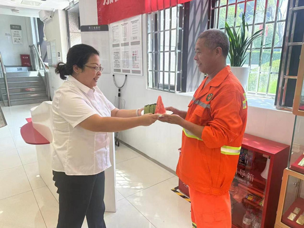 江北支行為辦理業(yè)務的客戶和納涼的環(huán)衛(wèi)工人提供降溫的西瓜。工行重慶市分行供圖
