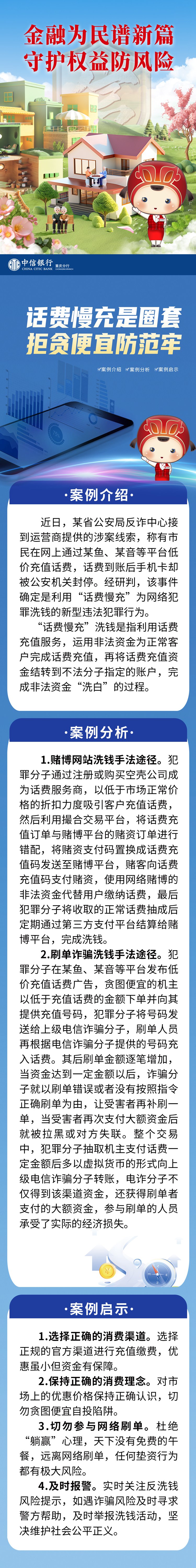 為向社會(huì)深入普及金融知識(shí),引導(dǎo)廣大人民群眾有效識(shí)別風(fēng)險(xiǎn),樹(shù)立理性的金融消費(fèi)觀、投資理財(cái)觀,切實(shí)提高防范金融風(fēng)險(xiǎn)能力。中信銀行重慶分行在2024年9月“金融教育宣傳月”活動(dòng)中,圍繞“金融為民譜新篇,守護(hù)權(quán)益防風(fēng)險(xiǎn)”主題口號(hào),特別推出“阿信金融知識(shí)小課堂”系列金融知識(shí)作品,旨在通過(guò)生動(dòng)有趣的案例解析,深入淺出地向社會(huì)公眾普及金融知識(shí),切實(shí)提升社會(huì)公眾金融素養(yǎng)及風(fēng)險(xiǎn)防范能力,積極營(yíng)造和諧健康金融環(huán)境。本期主題為:《話費(fèi)慢充是圈套,拒貪便宜防范牢》。(中信銀行重慶分行供圖)