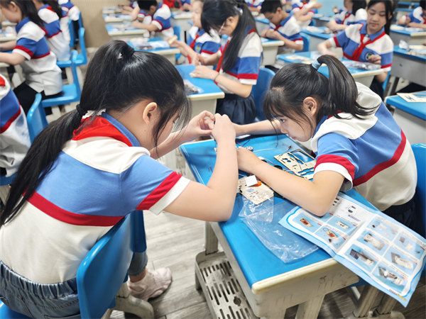 在實(shí)踐環(huán)節(jié)中,環(huán)保志愿者帶領(lǐng)學(xué)生們動手制作太陽能無線遙控車。通過組裝各個(gè)部件,學(xué)生們不僅鍛煉了動手能力,還直觀體驗(yàn)了新能源的實(shí)際應(yīng)用。五年級學(xué)生梁森豪興奮地表示:“今天的活動太有趣了,不但學(xué)到了碳中和碳達(dá)峰的知識,還動手做了太陽能遙控車,只要有太陽就能一直跑呢!”