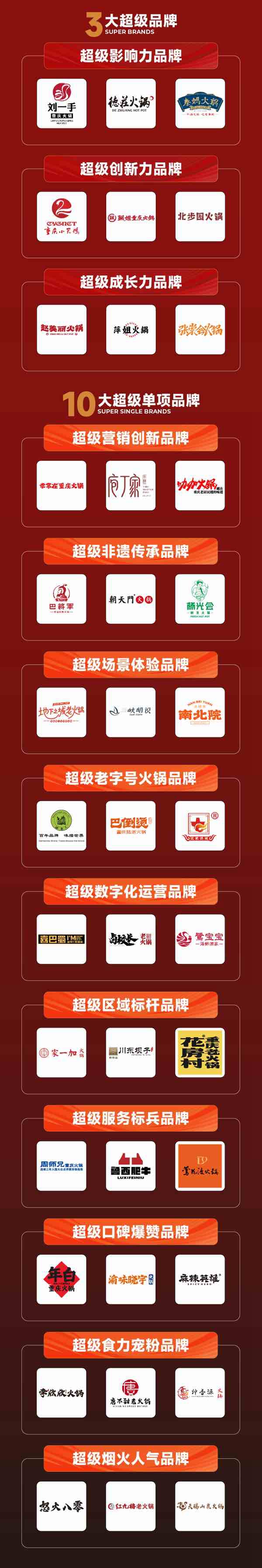 在評(píng)選中,德莊火鍋、劉一手火鍋以及秦媽火鍋憑借其廣泛的市場(chǎng)影響力獲得“超級(jí)影響力品牌”獎(jiǎng)項(xiàng);珮姐重慶火鍋、重慶小天鵝火鍋以及北步園火鍋因持續(xù)的產(chǎn)品創(chuàng)新摘得“超級(jí)創(chuàng)新力品牌”稱號(hào);而萍姐火鍋x公路夜市、趙美麗火鍋以及張崇會(huì)火鍋則在“超級(jí)成長(zhǎng)力品牌”評(píng)選中脫穎而出。
