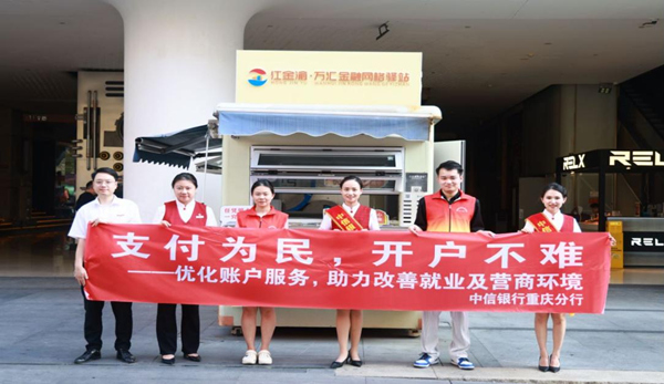在紅金渝·萬(wàn)匯金融網(wǎng)格驛站,中信銀行重慶分行的工作人員以“支付為民,開(kāi)戶不難——優(yōu)化賬戶服務(wù),助力改善就業(yè)及營(yíng)商環(huán)境”為宣傳標(biāo)語(yǔ),積極宣傳優(yōu)化開(kāi)戶服務(wù)。