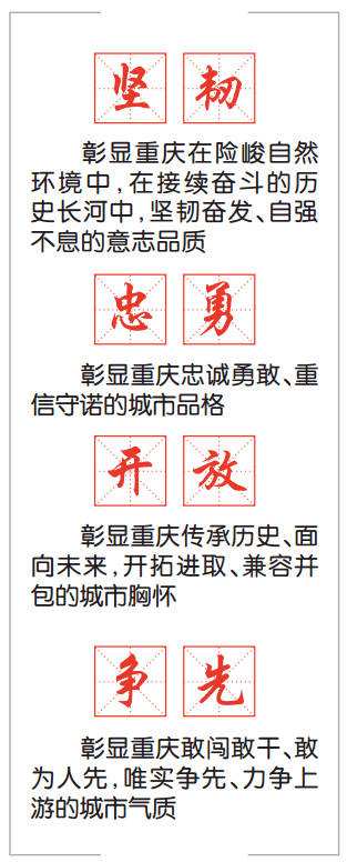 “堅(jiān)韌”彰顯重慶在險(xiǎn)峻自然環(huán)境中,在接續(xù)奮斗的歷史長河中,堅(jiān)韌奮發(fā)、自強(qiáng)不息的意志品質(zhì);“忠勇”彰顯重慶忠誠勇敢、重信守諾的城市品格;“開放”彰顯重慶傳承歷史、面向未來,開拓進(jìn)取、兼容并包的城市胸懷;“爭先”彰顯重慶敢闖敢干、敢為人先,唯實(shí)爭先、力爭上游的城市氣質(zhì)。