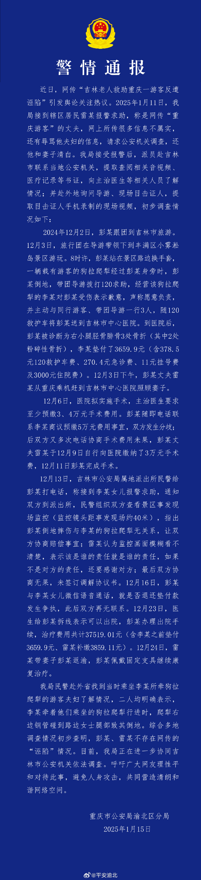 人民網(wǎng)重慶1月15日電 (記者劉政寧)1月15日,重慶市公安局渝北區(qū)分局就網(wǎng)傳“吉林老人救助重慶一游客反遭誣陷”一事發(fā)布警情通報(bào)。警方在通報(bào)中稱:綜合多地調(diào)查情況初步查明,彭某、雷某不存在網(wǎng)傳的“誣陷”情況。