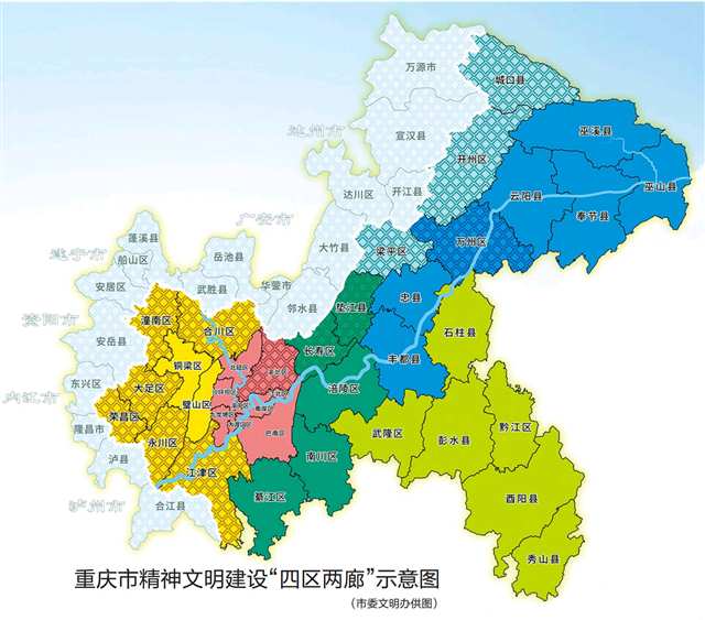 全市精神文明建設(shè)工作大格局的總體布局是“四區(qū)兩廊”,即因地制宜、分類施策,統(tǒng)籌推進(jìn)中心城區(qū)城市文明示范區(qū)、渝西城市文明涵養(yǎng)區(qū)、渝東新城城市文明涵養(yǎng)區(qū)、渝東南文明鄉(xiāng)風(fēng)示范區(qū),推動(dòng)三峽庫區(qū)沿江文明走廊建設(shè),協(xié)同四川省委宣傳部,進(jìn)一步打造川渝新時(shí)代文明實(shí)踐“一廊四帶”(覆蓋川渝30個(gè)區(qū)縣)。