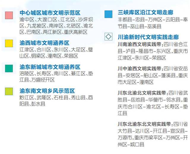 ●兩個(gè)涵養(yǎng)區(qū),即渝西城市文明涵養(yǎng)區(qū)、渝東新城城市文明涵養(yǎng)區(qū);