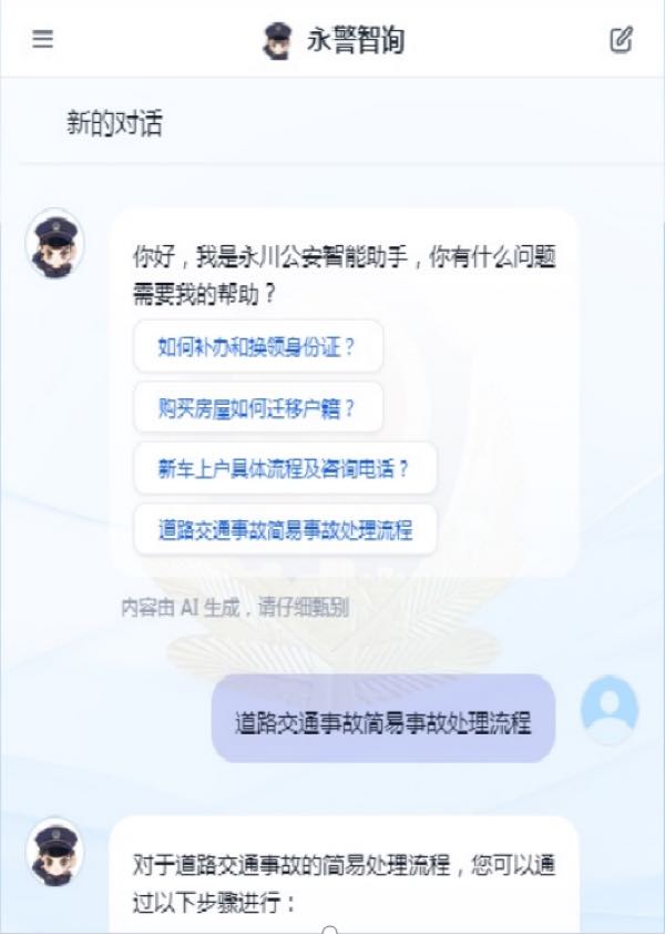 市民或企業(yè)只需關注“永川公安”微信公眾號,點擊“永警智詢”功能,便可通過文字對話形式,咨詢身份證補辦、交通事故處理、養(yǎng)犬登記、反詐知識等問題,平臺能實現秒級響應,并提供操作指引。此外,平臺還具備個性化服務能力,可根據用戶需求精準推薦業(yè)務辦理方案。