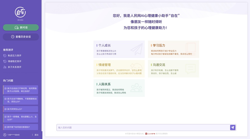 “自在”大模型依托人民日?qǐng)?bào)社傳播內(nèi)容認(rèn)知全國(guó)重點(diǎn)實(shí)驗(yàn)室開(kāi)發(fā),以“測(cè)評(píng)+咨詢”為核心功能,將人工智能技術(shù)與心理學(xué)專(zhuān)業(yè)知識(shí)相結(jié)合,致力于為家長(zhǎng)和教師提供心理疏導(dǎo)、情緒管理、親子交流、家校共育等服務(wù)。