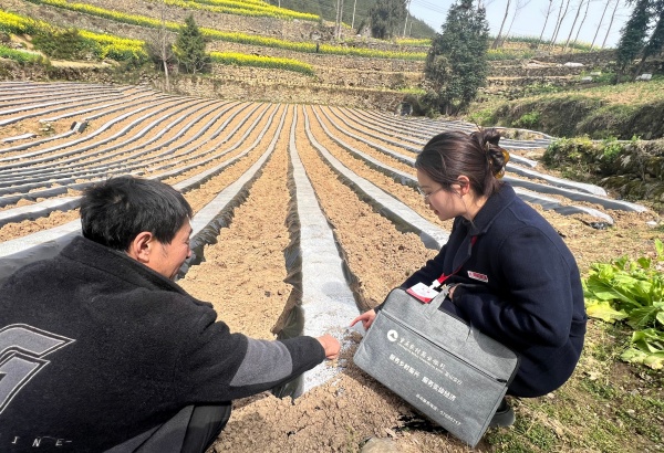 重慶農(nóng)商行巫山支行金融網(wǎng)格員實(shí)地查看農(nóng)戶羅旭的農(nóng)作物種植情況。重慶農(nóng)商行供圖