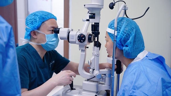 手術(shù)前,患者(右)接受眼部檢查。重醫(yī)附屬大學(xué)城醫(yī)院供圖