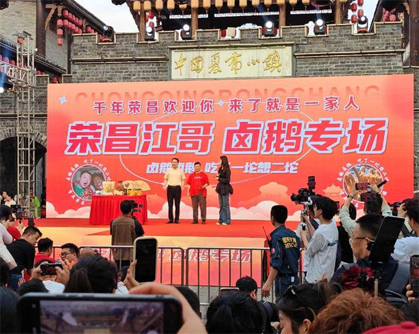 4月18日晚,“榮昌江哥”首場鹵鵝專場直播活動在榮昌夏布小鎮(zhèn)舉行,活動現(xiàn)場氣氛熱烈。來自全國各地的游客通過現(xiàn)場沉浸式體驗,深入了解非遺文化,品嘗當?shù)靥厣朗场,F(xiàn)場的直播活動吸引了全國超過500萬名網(wǎng)友在線觀看,互動點贊量超過1000萬次,創(chuàng)下當?shù)匚幕顒又辈サ男录o錄。