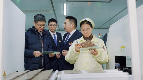重慶農(nóng)商行開州支行客戶經(jīng)理劉中武(左二)和易秦漢(左三)到重慶忠和實業(yè)有限公司進行貸前調(diào)查。重慶農(nóng)商行供圖