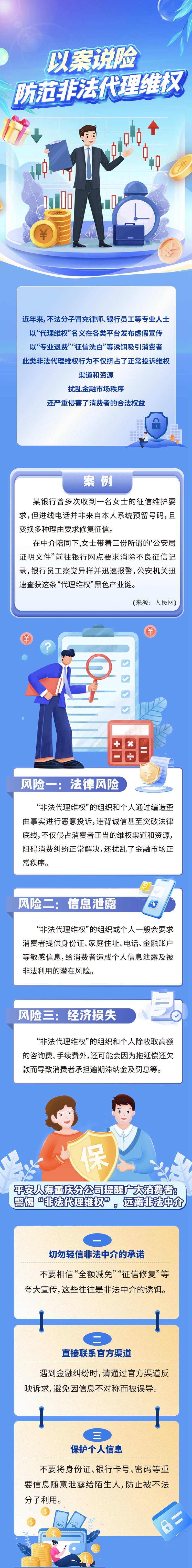近年來(lái),不法分子冒充律師、銀行員工等專業(yè)人士以“代理維權(quán)”名義在各類平臺(tái)發(fā)布虛假宣傳,以“專業(yè)退費(fèi)”“征信洗白”等誘餌吸引消費(fèi)者,此類非法代理維權(quán)行為不僅擠占了正常投訴維權(quán)渠道和資源,擾亂金融市場(chǎng)秩序,還嚴(yán)重侵害了消費(fèi)者的合法權(quán)益。(平安人壽重慶分公司)
