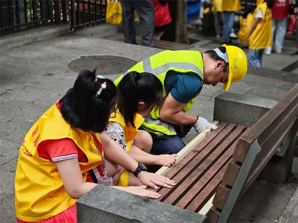 在“治理行動”環(huán)節(jié),小志愿者與社區(qū)工作者、家長協(xié)作,開展環(huán)境整治、美化社區(qū)等志愿服務(wù)。有的小組參與設(shè)施翻新,為老舊公共設(shè)備重新涂色;有的小組則清理苔蘚、補種綠植,為公共空間增添新意,贏得社區(qū)居民廣泛認可與支持。