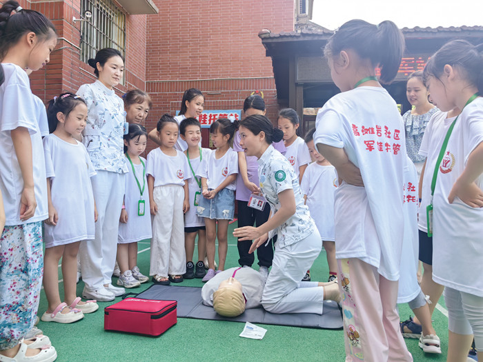 剛結(jié)束的體能訓(xùn)練熱度未消,孩子們又圍在西南醫(yī)院急診醫(yī)學(xué)科主任護師曾冬梅、主管護師王倩和黃祥城身邊,全神貫注地學(xué)習(xí)心肺復(fù)蘇技能。曾冬梅手把手地調(diào)整著孩子們按壓的姿勢和力度,知識的種子在指尖傳遞,安全的責(zé)任感悄然萌芽。
