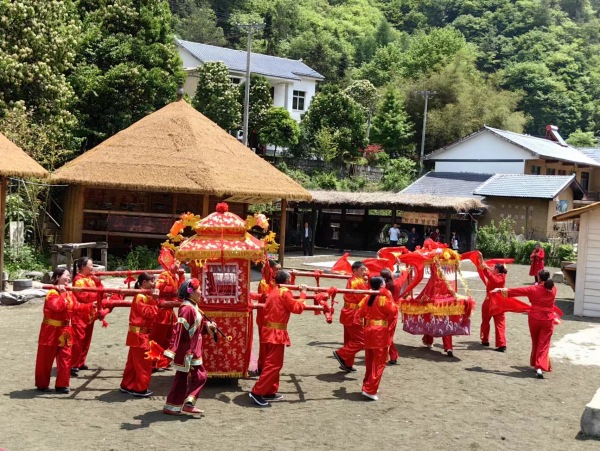 近年來,河魚鄉(xiāng)深挖“生態(tài)+文化”潛力,探索“文旅+婚嫁”融合發(fā)展新模式,讓山水資源與婚嫁文化深度綁定。除了精心打造“兩扇門”戶外頒證點這一“愛情地標”,當?shù)剡€組建起20余人的花轎隊伍,復(fù)原“八抬大轎”“騎鑼轎傘”等傳統(tǒng)婚嫁禮儀。這支隊伍不僅為游客提供沉浸式傳統(tǒng)婚俗體驗,更走入市場,活躍在陜西、四川達州及城口本地的接親現(xiàn)場,累計承辦婚禮100余場,讓古樸婚俗“活”起來、傳開來,贏得群眾廣泛好評。