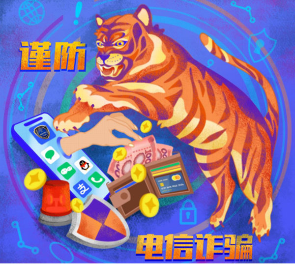 傳統(tǒng)文化里,虎象征力量、威嚴(yán)與勇猛,畫中老虎化身成打擊網(wǎng)絡(luò)詐騙的正義使者,憑借威猛氣勢(shì)震懾不法行徑。