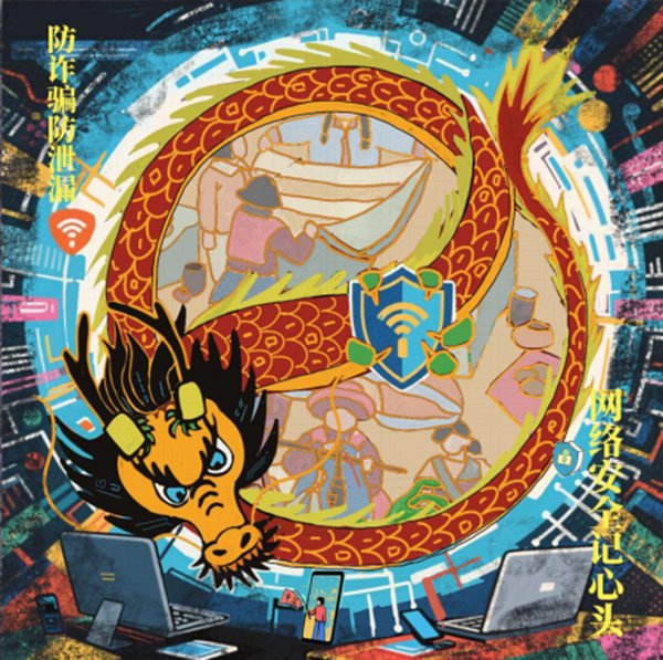 一條威嚴(yán)而靈動(dòng)的巨龍盤旋于虛擬網(wǎng)絡(luò)空間,龍身周圍環(huán)繞著流光溢彩的網(wǎng)絡(luò)信號(hào)線條與盾牌圖標(biāo),象征龍對(duì)網(wǎng)絡(luò)安全的守護(hù)。龍鱗以二進(jìn)制代碼精心繪制,既體現(xiàn)數(shù)字世界本質(zhì),又彰顯其抵御網(wǎng)絡(luò)風(fēng)險(xiǎn)的強(qiáng)大力量。四周環(huán)繞現(xiàn)代網(wǎng)絡(luò)場(chǎng)景,人們?cè)谄涫刈o(hù)下安全操作電腦、手機(jī)等設(shè)備,展現(xiàn)網(wǎng)絡(luò)安全為生活提供的堅(jiān)實(shí)保障。整體作品色彩濃烈鮮艷,既延續(xù)農(nóng)民畫鄉(xiāng)土藝術(shù)風(fēng)格,又生動(dòng)傳遞網(wǎng)絡(luò)安全的重要性,寓意在傳統(tǒng)文化力量的庇護(hù)下,人們得以享有安全和諧的網(wǎng)絡(luò)環(huán)境,安居樂業(yè)。
