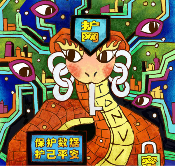 傳統(tǒng)文化中,蛇常被賦予神秘色彩與守護(hù)特質(zhì),如民間信仰中庇佑家宅的形象。畫中蛇身披仿若城墻磚的紋理,頭頂象征科技防護(hù)的“盾牌”裝飾,盤繞于交織的網(wǎng)絡(luò)線路與城市輪廓之上,寓意其化身網(wǎng)絡(luò)守護(hù)者。它借傳統(tǒng)守護(hù)之魂抵御網(wǎng)絡(luò)風(fēng)險(xiǎn),以環(huán)繞周身的科技之眼洞察虛擬世界,并通過指紋識(shí)別、鎖等符號(hào),詮釋守護(hù)網(wǎng)絡(luò)安全、傳承文化精神的新使命,展現(xiàn)傳統(tǒng)生肖在數(shù)字時(shí)代的創(chuàng)新表達(dá)。