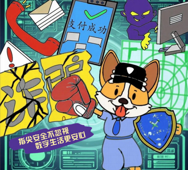 忠誠(chéng)可靠的狗狗身穿筆挺警服、手持拳套與盾牌,象征時(shí)刻守護(hù)的網(wǎng)絡(luò)安全衛(wèi)士,重拳打擊詐騙?!爸Ц冻晒Α碧崾军c(diǎn)出常見詐騙場(chǎng)景,電話、信封等元素關(guān)聯(lián)通訊詐騙手段,紫色“惡魔”則代表幕后黑手,共同構(gòu)筑典型網(wǎng)絡(luò)詐騙環(huán)境。背景的科技網(wǎng)格強(qiáng)化網(wǎng)絡(luò)安全主題,警示公眾警惕各類網(wǎng)絡(luò)騙局,借生肖狗忠誠(chéng)守護(hù)的意象,傳遞筑牢網(wǎng)絡(luò)安全防線、堅(jiān)決防范詐騙的理念。