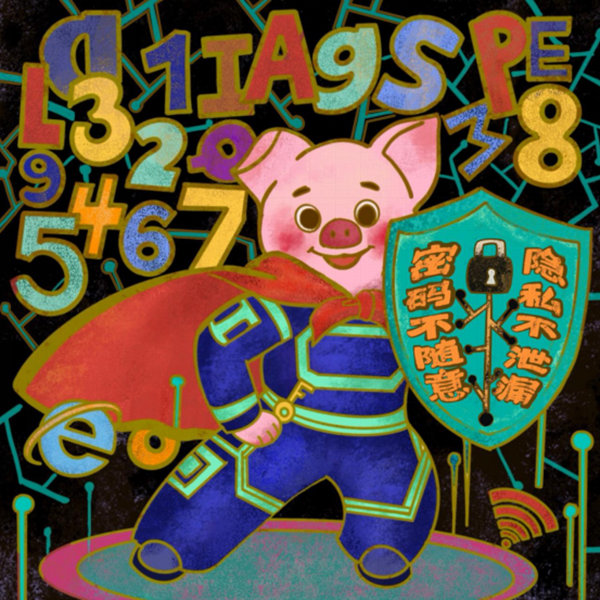 畫面C位的粉紅小豬身披鮮紅斗篷,身著藍(lán)綠條紋裝飾的"勇士戰(zhàn)袍",一手高擎象征上網(wǎng)密碼的金鑰匙,一手緊握繪有鎖形筆記本圖案的守護(hù)之盾,傲然挺立捍衛(wèi)著網(wǎng)絡(luò)密碼的安全疆域。背景中繽紛的數(shù)字與字母躍動(dòng)交織,在奔涌的數(shù)據(jù)洪流中昭示著設(shè)置復(fù)雜密碼的關(guān)鍵意義。畫面下方巧妙點(diǎn)綴著無線信號(hào)圖標(biāo)與互聯(lián)網(wǎng)標(biāo)識(shí)等元素,凸顯安全穩(wěn)定的網(wǎng)絡(luò)環(huán)境對(duì)線上活動(dòng)的重要守護(hù)。(綦江區(qū)委宣傳部)
