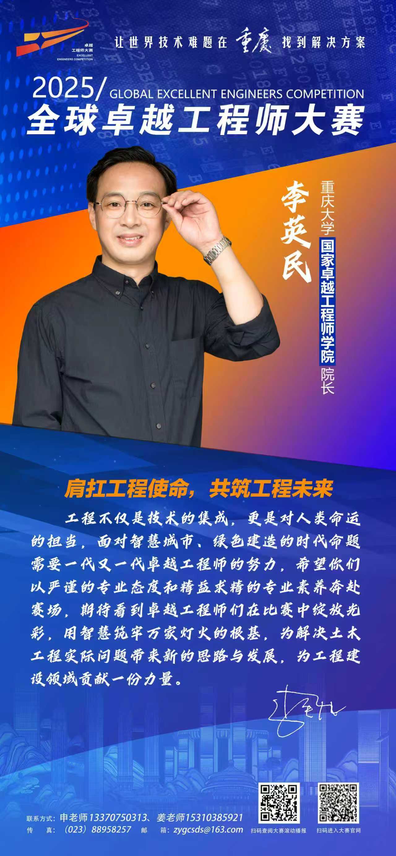 10月22日,重慶大學(xué)國家卓越工程師學(xué)院院長李英民向全球卓越工程師大賽·2025年度發(fā)來推介詞:工程不僅是技術(shù)的集成,更是對人類命運的擔(dān)當(dāng),面對智慧城市、綠色建造的時代命題需要一代又一代卓越工程師的努力,希望你們以嚴謹?shù)膶I(yè)態(tài)度和精益求精的專業(yè)素養(yǎng)奔赴賽場,期待看到卓越工程師們在比賽中綻放光彩,用智慧筑牢萬家燈火的根基,為解決土木工程實際問題帶來新的思路與發(fā)展,為工程建設(shè)領(lǐng)域貢獻一份力量。