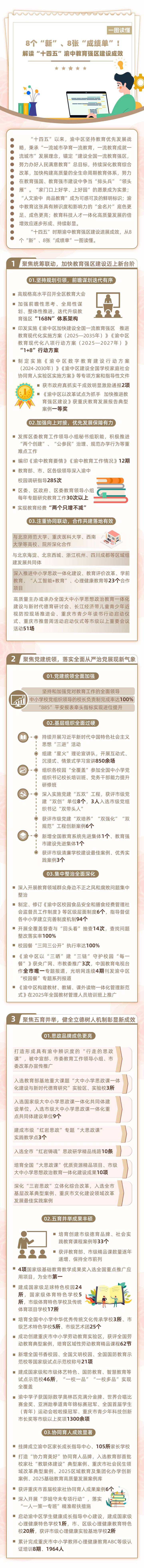 “十四五”以來,渝中區(qū)堅(jiān)持教育優(yōu)先發(fā)展戰(zhàn)略,錨定“建設(shè)全國一流教育強(qiáng)區(qū),努力辦好人民滿意教育”總目標(biāo),持續(xù)深化教育改革,加快構(gòu)建高質(zhì)量全生命周期教育體系。“家門口上好學(xué)、上好園”成為現(xiàn)實(shí),“人文渝中 尚品教育”標(biāo)識更加鮮明,渝中教育“金名片”底色更足、成色更亮,教育科技人才一體化發(fā)展的倍增效應(yīng)持續(xù)顯現(xiàn)。一圖讀懂“十四五”時(shí)期渝中教育強(qiáng)區(qū)建設(shè)進(jìn)展成效。(渝中區(qū)教委)