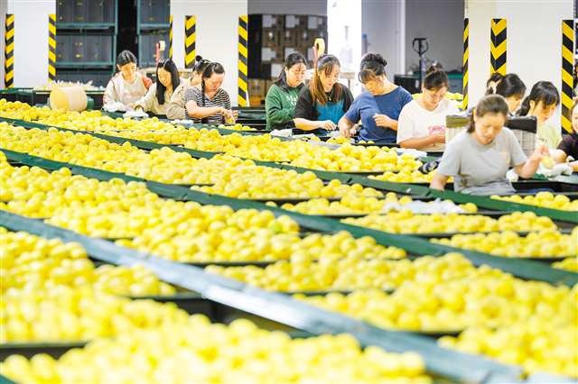 近日,潼南區(qū)雪王農(nóng)業(yè)有限公司車間內(nèi),工人在包裝檸檬鮮果。