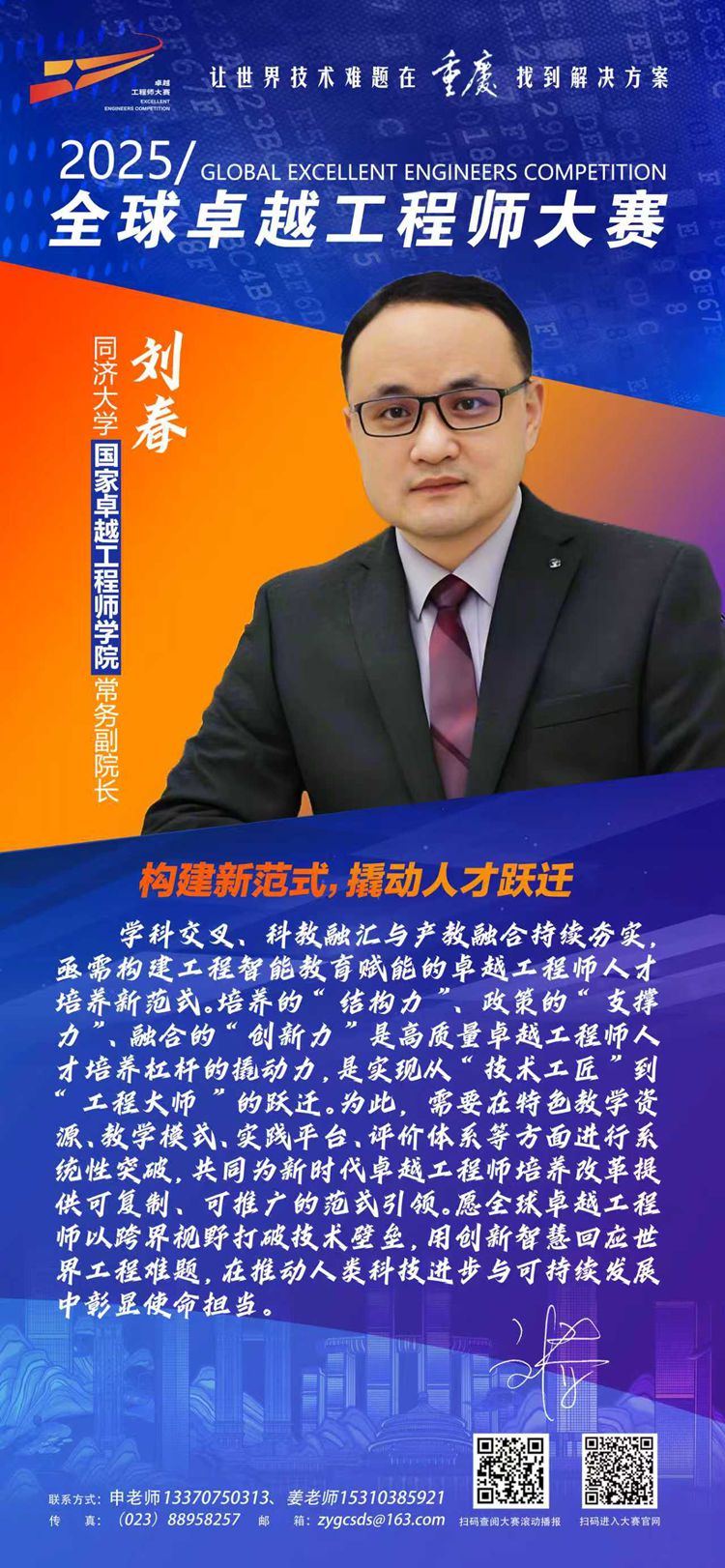 11月4日,同濟(jì)大學(xué)國(guó)家卓越工程師學(xué)院常務(wù)副院長(zhǎng)劉春向全球卓越工程師大賽·2025年度發(fā)來推介詞:學(xué)科交叉、科教融匯與產(chǎn)教融合持續(xù)夯實(shí),亟需構(gòu)建工程智能教育賦能的卓越工程師人才培養(yǎng)新范式。培養(yǎng)的“結(jié)構(gòu)力”、政策的“支撐力”、融合的“創(chuàng)新力”是高質(zhì)量卓越工程師人才培養(yǎng)杠桿的撬動(dòng)力,是實(shí)現(xiàn)從“技術(shù)工匠”到“工程大師”的躍遷。為此,需要在特色教學(xué)資源、教學(xué)模式、實(shí)踐平臺(tái)、評(píng)價(jià)體系等方面進(jìn)行系統(tǒng)性突破,共同為新時(shí)代卓越工程師培養(yǎng)改革提供可復(fù)制、可推廣的范式引領(lǐng)。愿全球卓越工程師以跨界視野打破技術(shù)壁壘,用創(chuàng)新智慧回應(yīng)世界工程難題,在推動(dòng)人類科技進(jìn)步與可持續(xù)發(fā)展中彰顯使命擔(dān)當(dāng)。