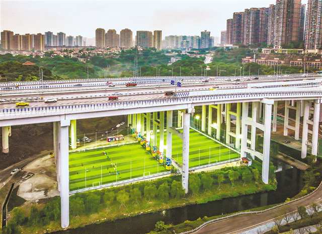 11月3日,九龍坡區(qū)五臺山足球公園,足球愛好者在橋下的球場內(nèi)運(yùn)動。