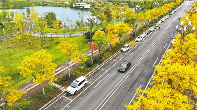 11月10日,墊江縣桂溪街道片區(qū),公路兩側(cè)行道樹樹葉由青轉(zhuǎn)黃,令人賞心悅目,成為一道獨特的城市風(fēng)景線(無人機照片)。