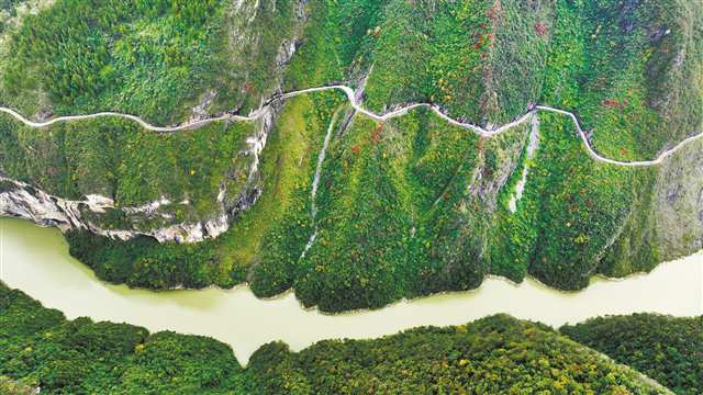 11月11日,車輛行駛在黔江區(qū)阿蓬江鎮(zhèn)的一條連接兩村的“掛壁公路”上。