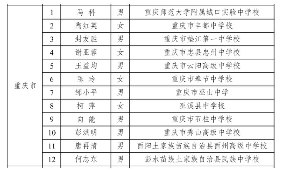 11月13日,教育部辦公廳發(fā)布通知,確定首批全國(guó)縣域普通高中頭雁教師崗位計(jì)劃入選教師600人。其中,重慶共12人入選。
