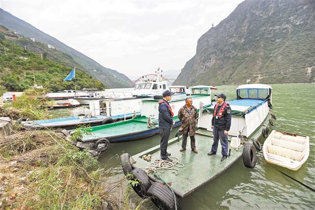 11月14日,巫山縣跳石水域,海事執(zhí)法人員正在檢查碼頭情況。