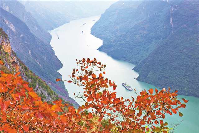 11月22日,船只航行在紅葉映襯下的長江三峽巫峽段。第十九屆重慶長江三峽(巫山)國際紅葉節(jié)于當(dāng)晚開幕,巫山120萬畝紅葉進(jìn)入最佳觀賞期。